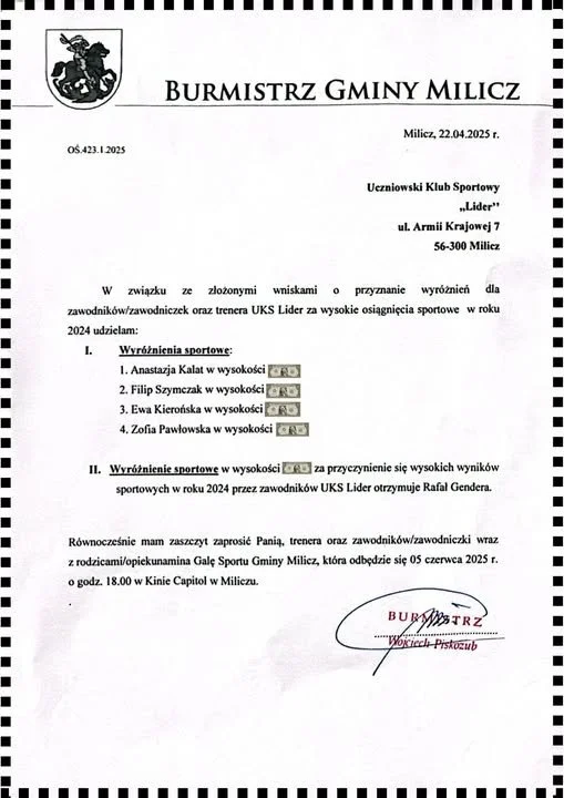 Jest nam niezmiernie miło i pragniemy bardzo serdecznie podziękować komisji konkursowej , która pozytywnie rozpatrzyła wnioski Zarządu UKS "Lider" Milicz. Nagrodzenie naszych podopiecznych za wysokie wyniki sportowe w roku 2024r. to powód do dumy i ciężkiej pracy, wyrzeczeń i odmawiania sobie wielu przyjemności. Tym bardziej się cieszymy, że wszystkie kandydatury, które zostały przez nas przedstawione we wnioskach, przeszły pozytywną weryfikację, a ich wkład w promocję Gminy Milicz został zauważony.